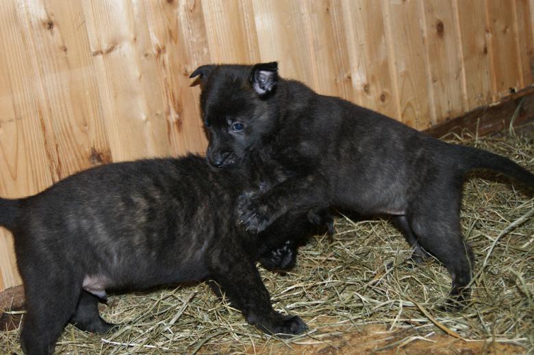 Die Minis sind jetzt endgültig nach draußen übersiedelt. Im Innenzwinger haben sie neben Flatterbändern und aufgehängten Flaschen auch diverse Spielzeuge und ein Bällebecken zum Toben zur Verfügung. Außerdem gewöhne ich sie bereits an Radiolärm und Alltagsgeräusche wie etwa einen Haarföhn - und ja, gut möglich, dass mich die Nachbarn für leicht verrückt halten, wenn ich mit diversen Elektrogeräten bewaffnet durch den Garten haste *g*. Das Spiel der Welpen wird immer wilder, da wird schon richtig böse geknurrt und auch feste zugepackt. Auch Finger, Ärmel, Schlapfen und Hosenbeine fallen den Streifenterroristen immer häufiger zum Opfer und werden begeistert festgehalten und gebeutelt. Langsam lassen sich im Spiel auch erste Charakterzüge erahnen - es ist wirklich faszinierend die Welpen zu beobachten. Dieses Wochenende kommt der erste Schwung zukünftiger Welpenmamis und -papis zu Besuch, um die Zwerge kennen zu lernen und natürlich hab ich mich schon brav mit Kuchen und Kaffee eingedeckt.