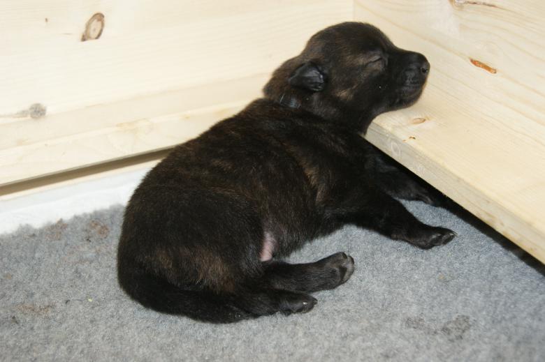 Die Zwerge entwickeln sich jetzt mit Riesenschritten. Die ersten zwei Rüden haben heute begonnen die Augen zu öffnen und allesamt stemmen sich die Zwerge beim Herumkriechen schon auf ihre Beinchen. Das Ganze ist zwar noch etwas wackelig und Bauchlandungen bzw. sehr akrobatische Purzelbäume sind vorprogrammiert, aber die Welpen lassen sich nicht entmutigen.