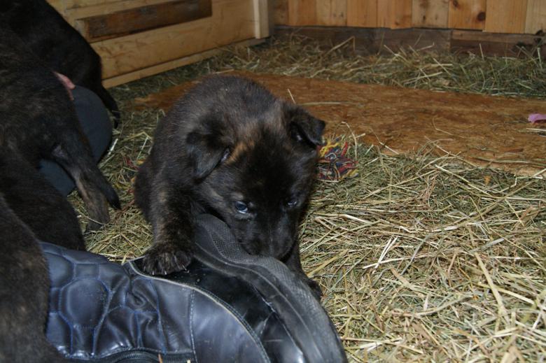Die Minis sind jetzt endgültig nach draußen übersiedelt. Im Innenzwinger haben sie neben Flatterbändern und aufgehängten Flaschen auch diverse Spielzeuge und ein Bällebecken zum Toben zur Verfügung. Außerdem gewöhne ich sie bereits an Radiolärm und Alltagsgeräusche wie etwa einen Haarföhn - und ja, gut möglich, dass mich die Nachbarn für leicht verrückt halten, wenn ich mit diversen Elektrogeräten bewaffnet durch den Garten haste *g*. Das Spiel der Welpen wird immer wilder, da wird schon richtig böse geknurrt und auch feste zugepackt. Auch Finger, Ärmel, Schlapfen und Hosenbeine fallen den Streifenterroristen immer häufiger zum Opfer und werden begeistert festgehalten und gebeutelt. Langsam lassen sich im Spiel auch erste Charakterzüge erahnen - es ist wirklich faszinierend die Welpen zu beobachten. Dieses Wochenende kommt der erste Schwung zukünftiger Welpenmamis und -papis zu Besuch, um die Zwerge kennen zu lernen und natürlich hab ich mich schon brav mit Kuchen und Kaffee eingedeckt.