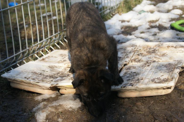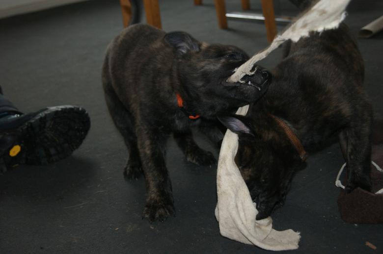 Heute waren die kleinen A's auf ihrem ersten großen Ausflug und zwar bei uns am Hundeplatz. Beim Autofahren hin und zurück wurde die ersten zehn Minuten empört gequängelt, dann haben die Zwerge den Rest der Fahrt brav vor sich hin gemützt. Gleich nach der Ankunft wurde das Vereinsheim von den Streifenterroristen erobert und die anwesenden Leute in Beschlag genommen. Die Zwerge haben ordentlich herumgetobt und sämtliche verfügbaren Ärmel, Hände, Schuhbänder und angebotene Lederfetzen attackiert - dabei ging es teilweise richtig grantig zur Sache *g* (R.I.P., lieber Pulloverärmel, der Akasha und Artemis zum Opfer gefallen ist.)